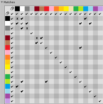 You can click any cell to toggle if that pair of colors matches.